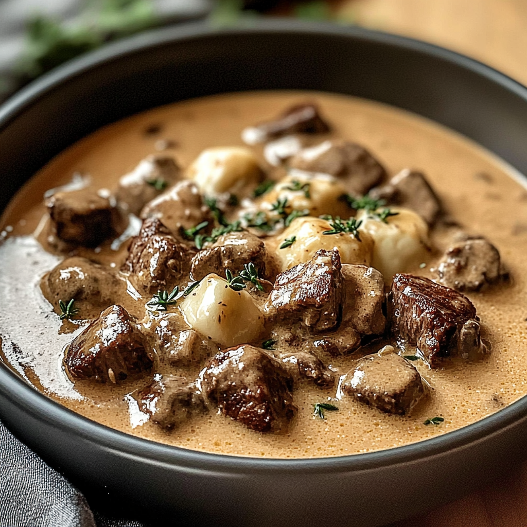 - The flavor profile combines savory beef with creamy sauce and earthy mushrooms