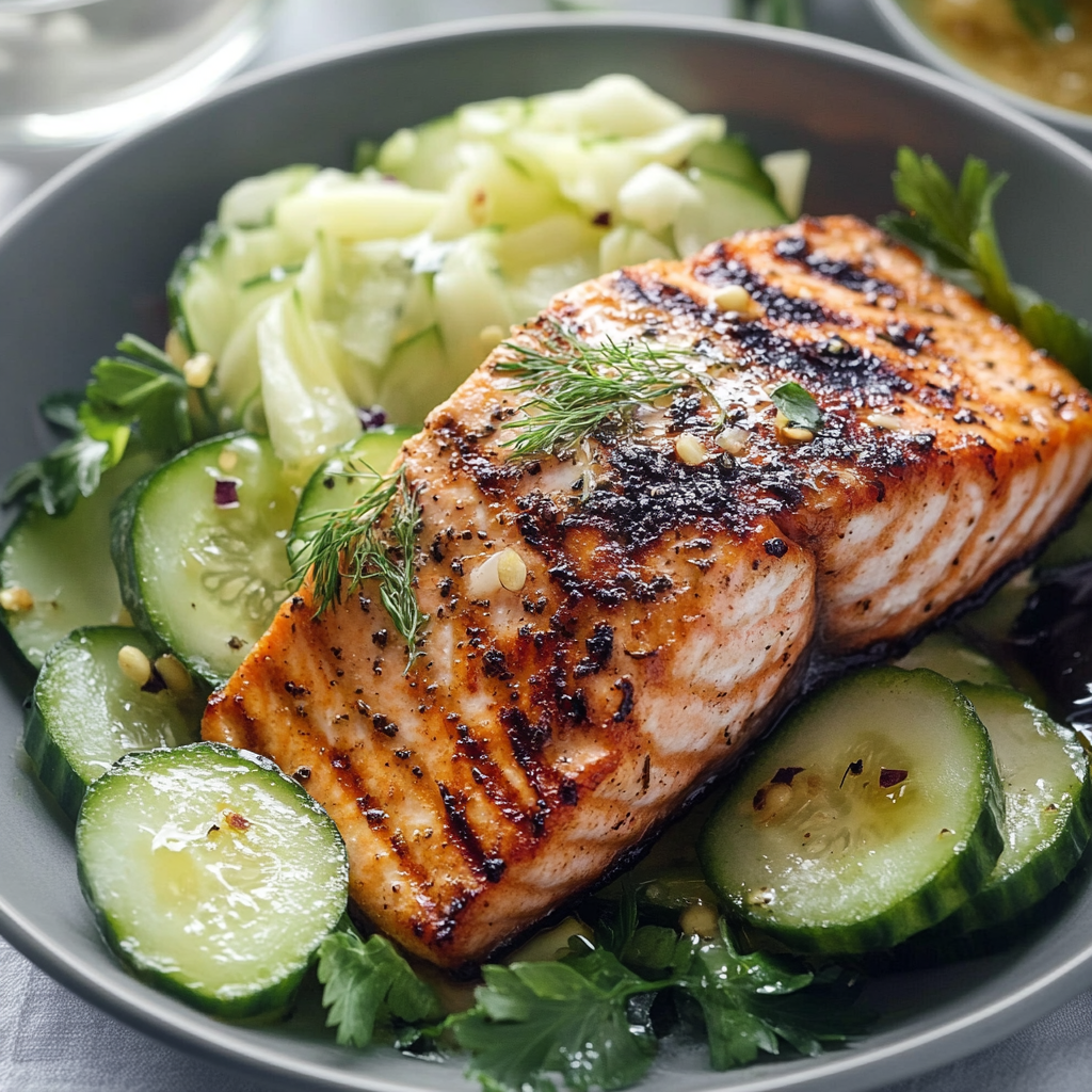 - Serve grilled salmon alongside cucumber salad and enjoy!