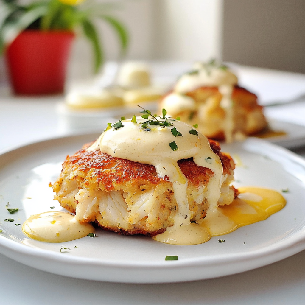 - Toast the English muffins and assemble: place a crab cake on each half, top with a poached egg, drizzle hollandaise sauce, and garnish with parsley.