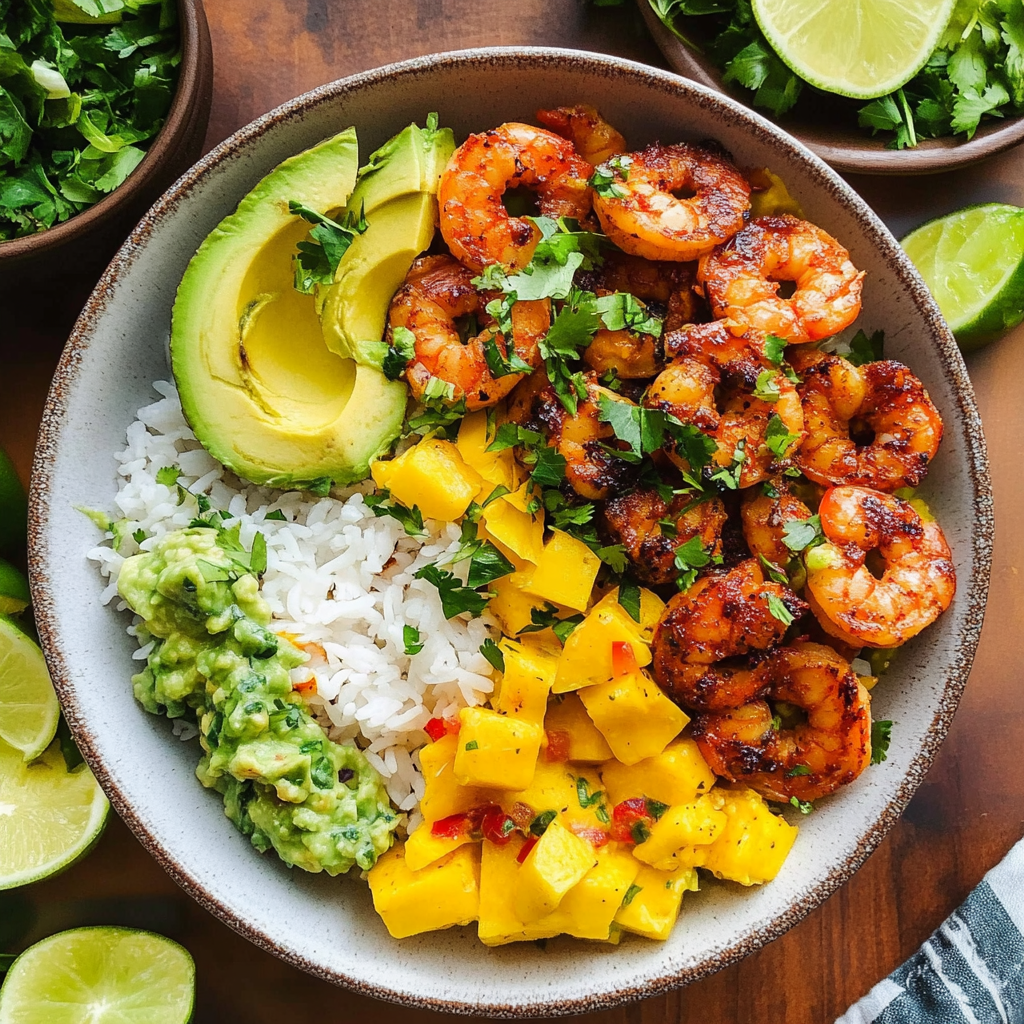 - To assemble, layer sliced avocado in bowls, top with cooked shrimp, then spoon mango salsa over everything.