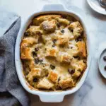 Combine ingredients: Pour the custard over the torn bread pieces, ensuring every piece gets soaked. Gently fold in raisins or dried fruit if you’re using them. Let it sit for about 10 minutes so the bread absorbs all that creamy goodness.