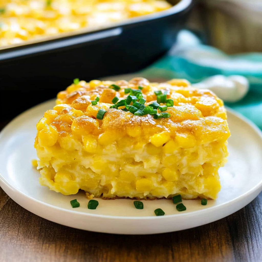 comfort food / corn recipe / creamy dish / family recipe / fluffy pudding / golden crust / party food / savory dessert