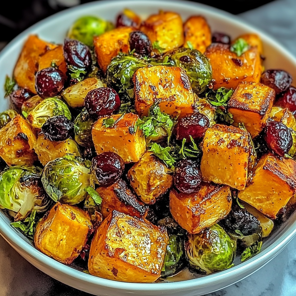 Brussels sprouts / butternut squash / glazed vegetables / holiday side / salad recipe / sweet potato / vegan dish