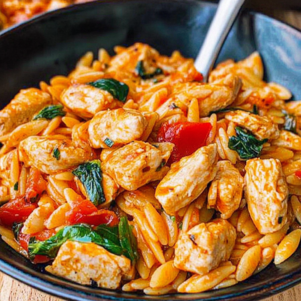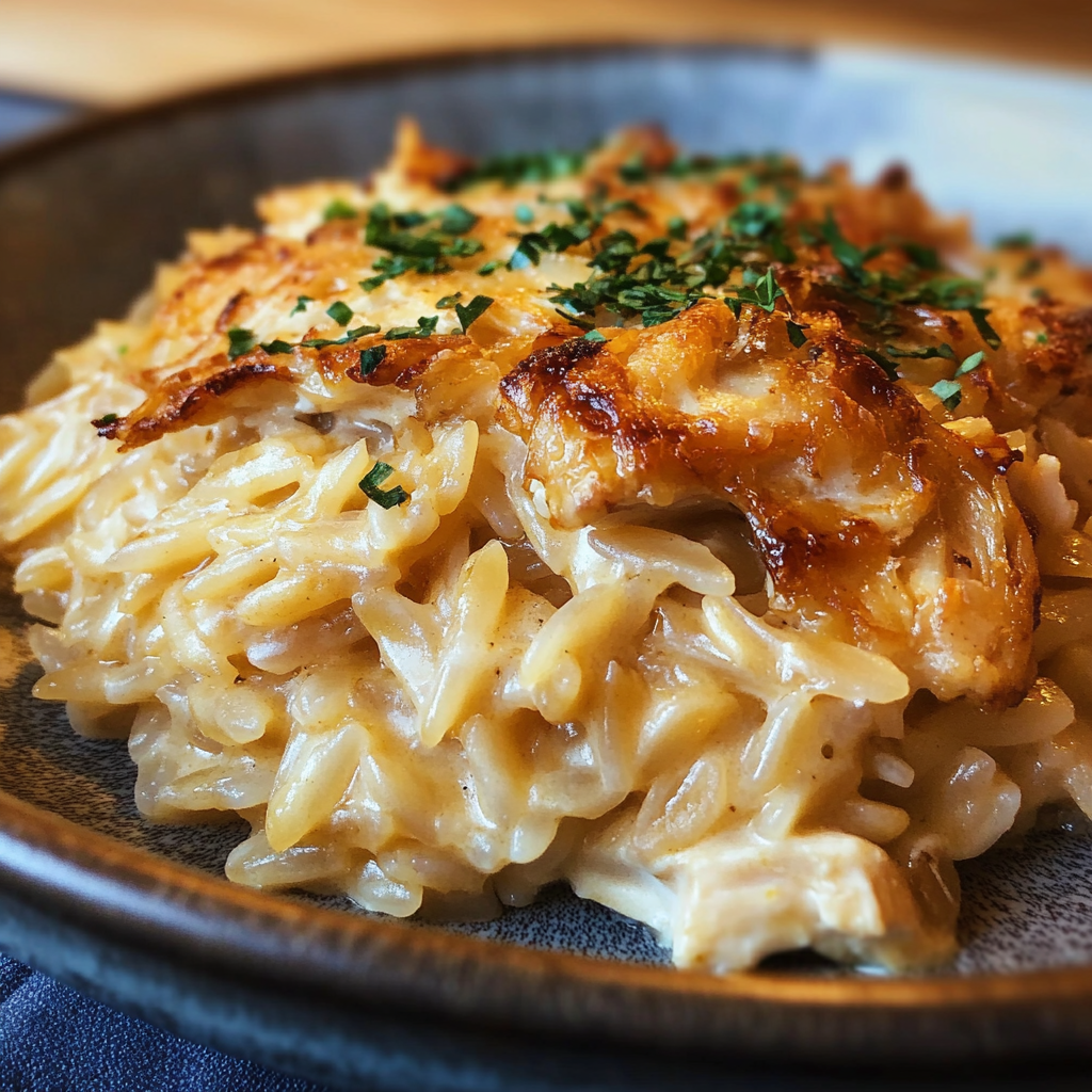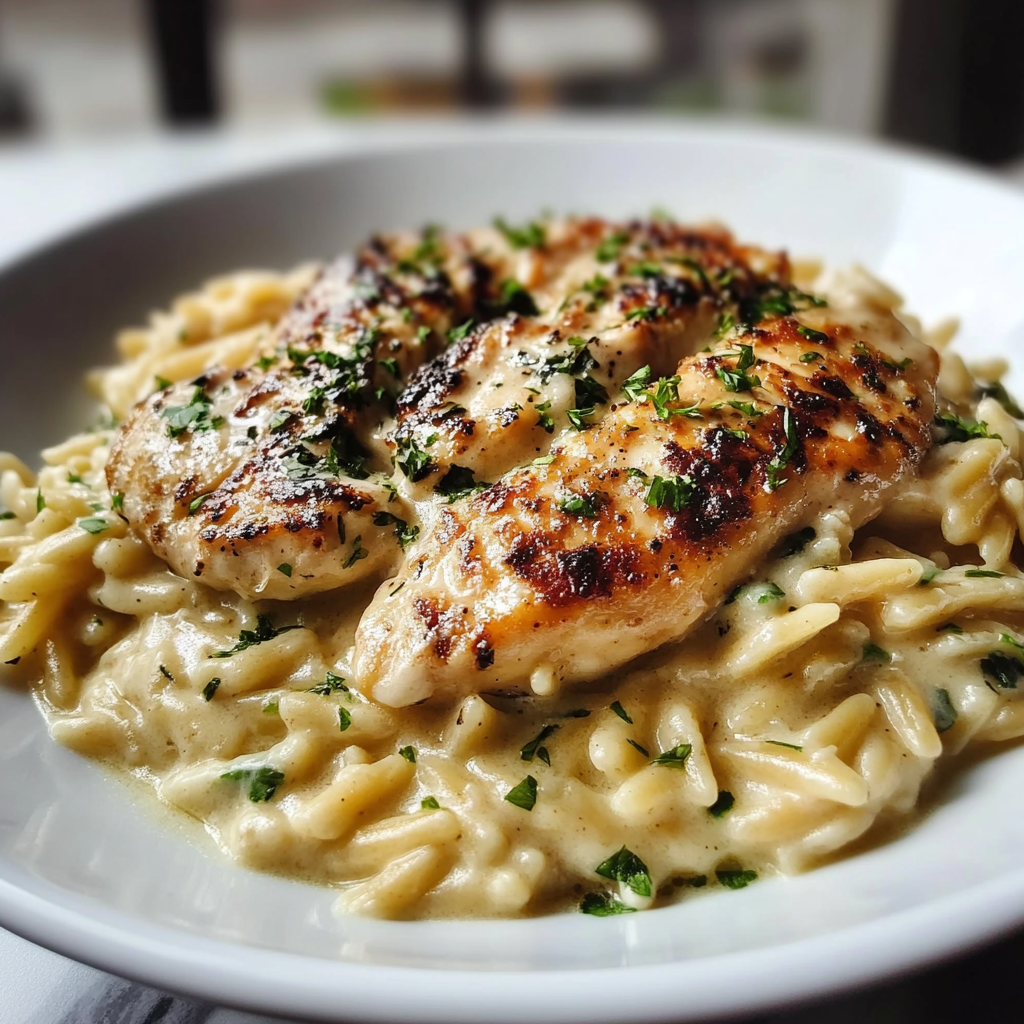 comfort food / creamy chicken / easy dinner / family meal / garlic flavor / orzo recipe / parmesan sauce
